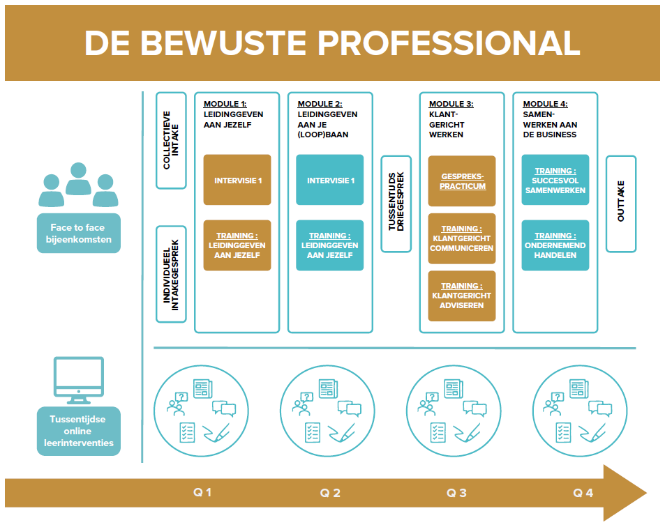Het programma bestaat uit een combinatie van online en offline leerinterventies en van individuele en groepssessies. Hieronder zie je de opbouw van het programma visueel weergegeven.