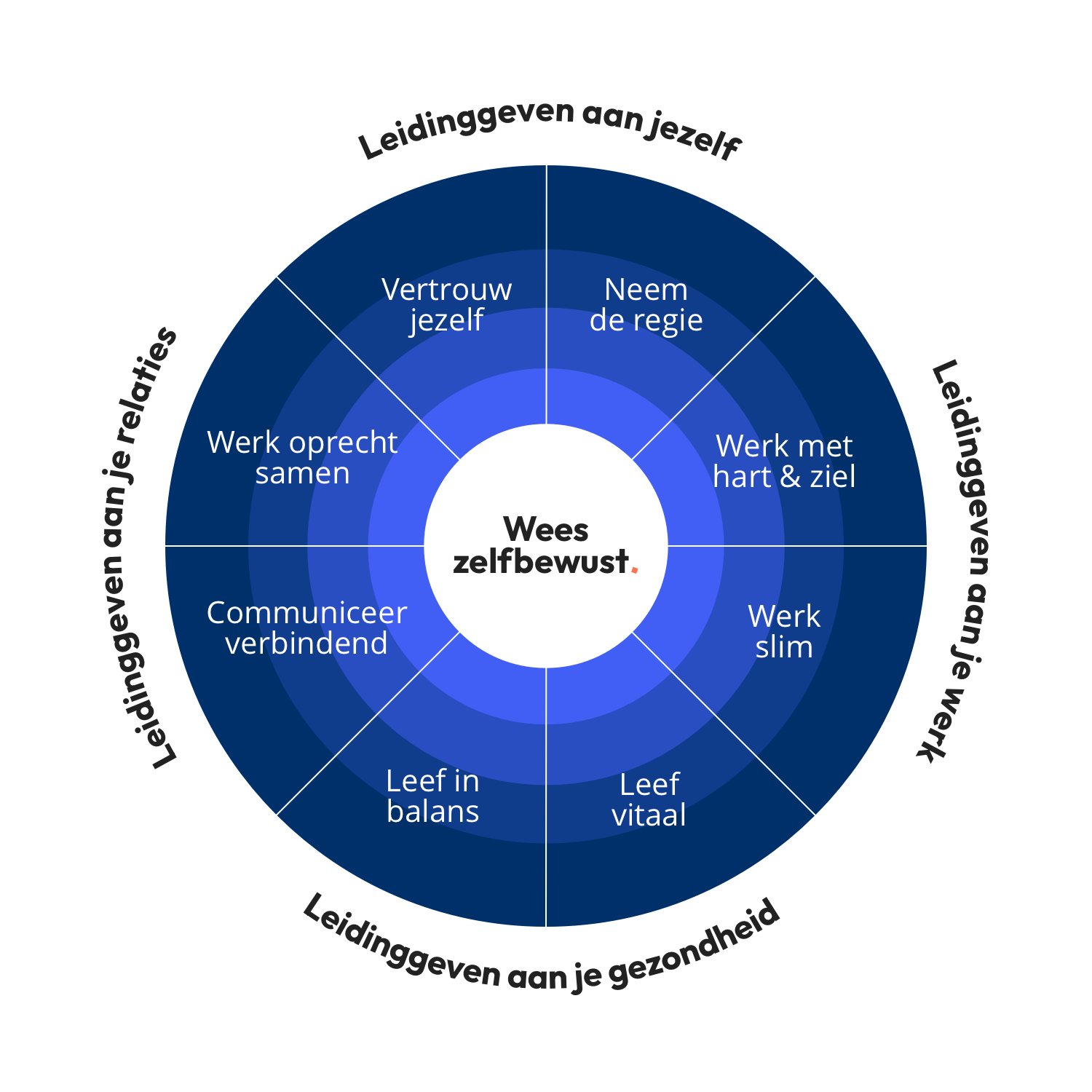 Centraal in het kompas staat ‘Wees zelfbewust’. Persoonlijk leiderschap begint wat ons betreft met het ontwikkelen van zelfbewustzijn.